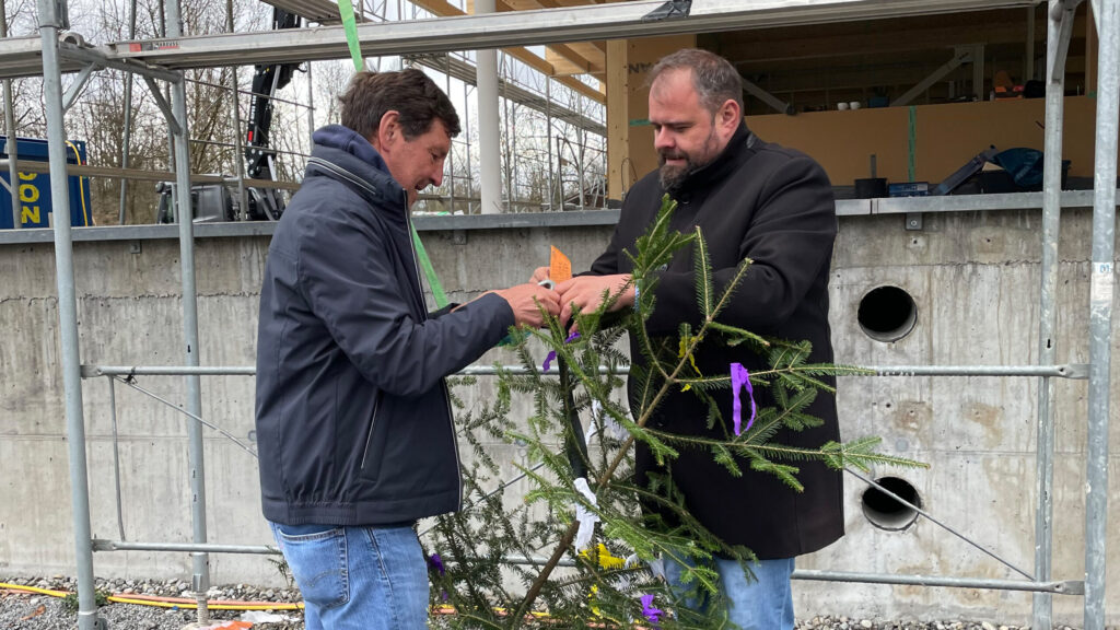 Mit der Firstfeier wurde ein entscheidender Meilenstein beim Wiederaufbau der Sportanlage Rohrbach erreicht. Ein besonderes Symbol für den gemeinsamen Fortschritt war die Vorbereitung des Firstbaums durch Bürgermeister Markus Fäßler und Vereinspräsident Gerhard Ritter.