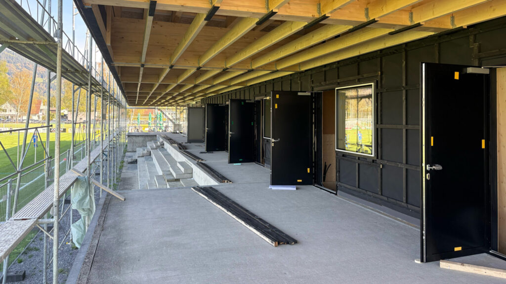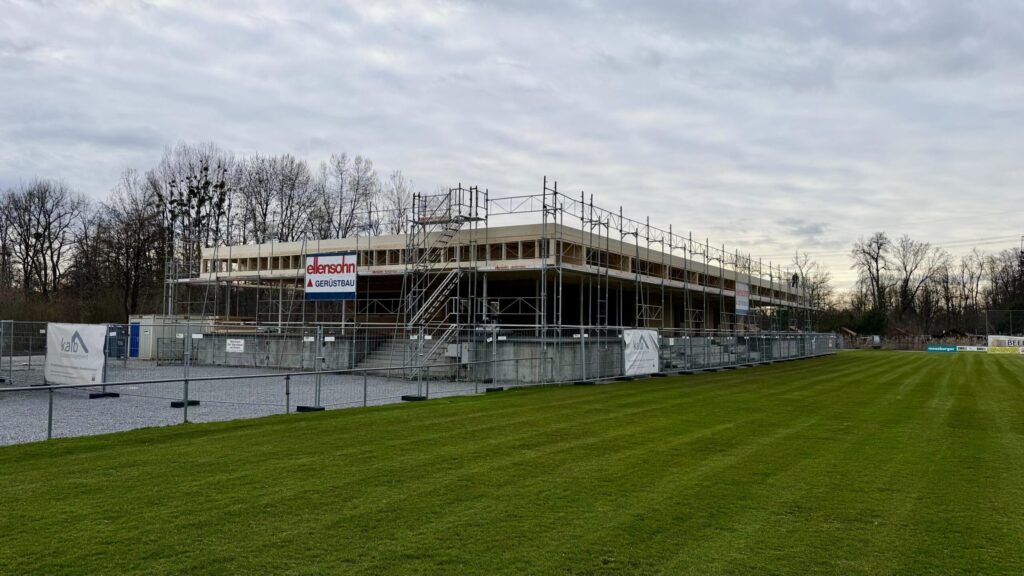 Etwas mehr als einen Monat nach Baubeginn ist der nächste große Fortschritt an der Sportanlage Rohrbach deutlich sichtbar: Sämtliche Fenster und Türen wurden erfolgreich eingesetzt. Damit ist das Gebäude nun vollständig geschlossen, was den Innenausbau optimal vorantreibt. Während die Fassadenverkleidung aktuell noch fehlt und dem Sportheim in einem der nächsten Schritte sein endgültiges Gesicht verleihen wird, liegt der Fokus nun voll und ganz auf den technischen Installationen im Inneren.